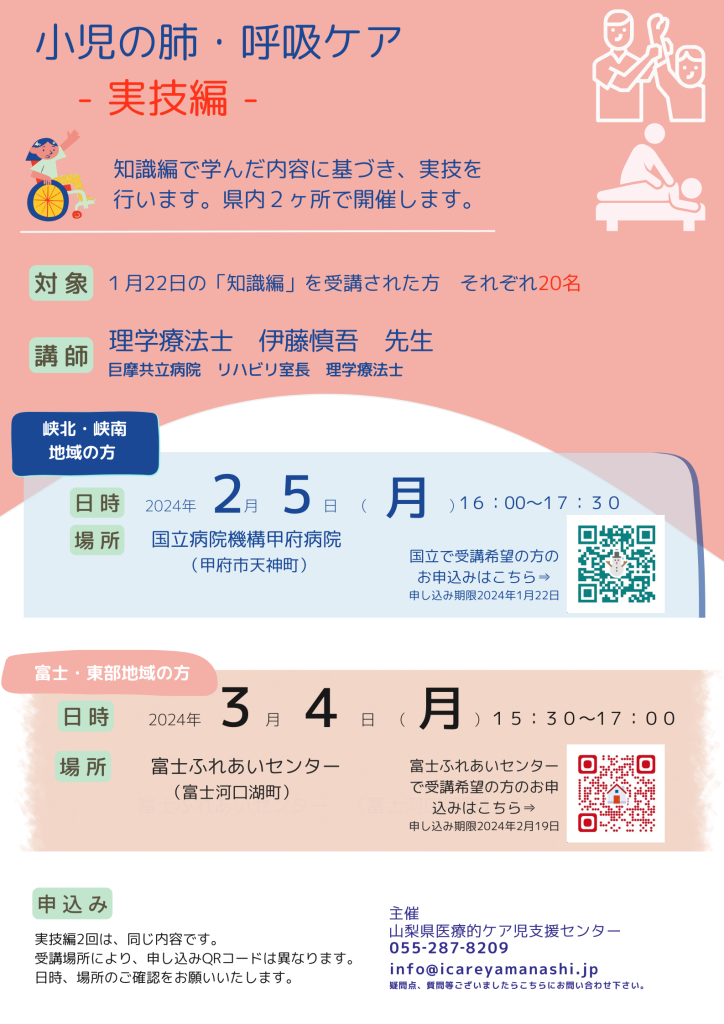 2月5日、3月4日に今回の研修の応用編となる小児の肺・呼吸ケア‐実技編‐を対面にて開催いたします。今回参加してくださった方々はぜひこちらにもご参加いただければと思います。