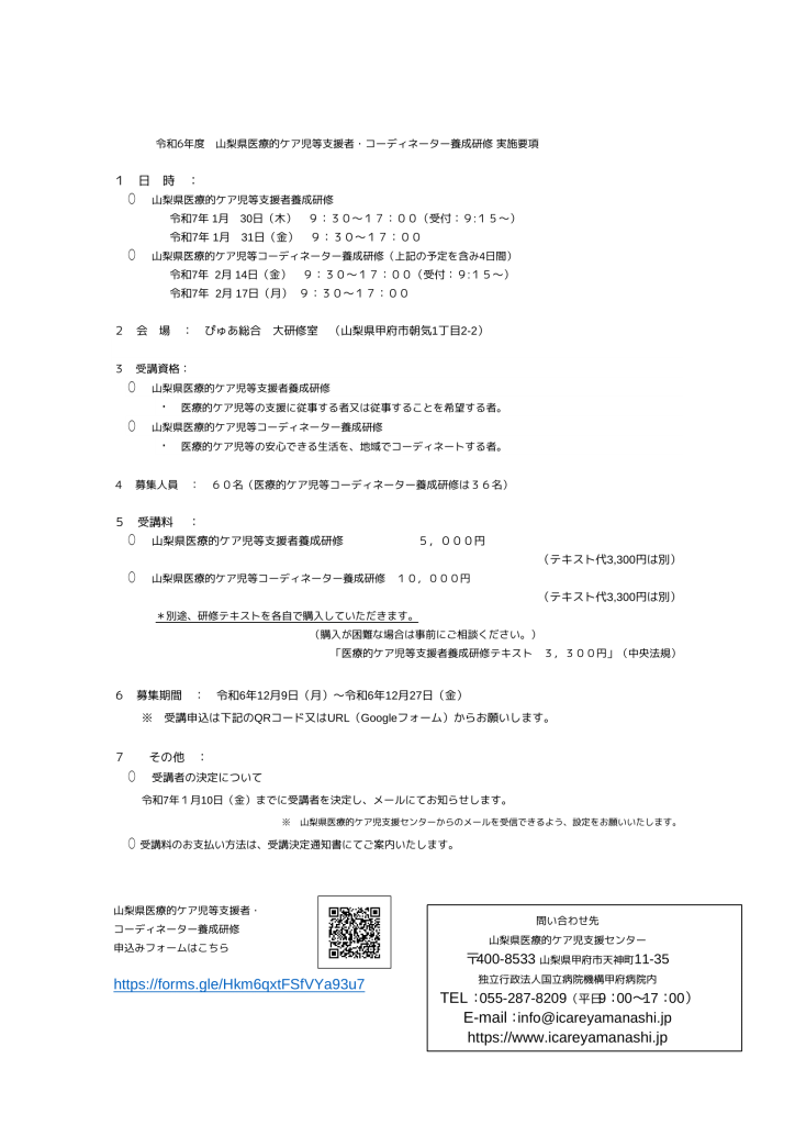 令和6年度 山梨県医療的ケア児等支援者・コーディネーター養成研修 のお知らせ 研修・講習 2024.12.10 山梨県医療的ケア児等支援者・コーディネーター研修申込URLはこちらhttps://forms.gle/Hkm6qxtFSfVYa93u7