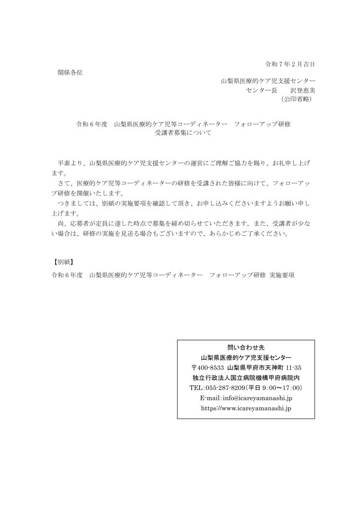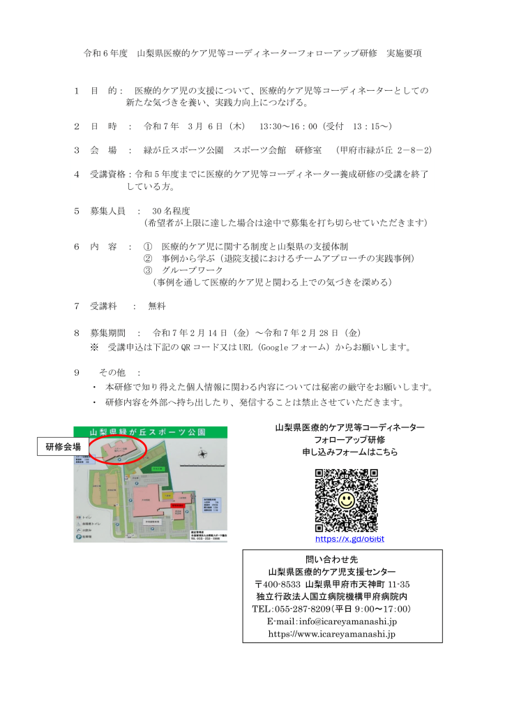 令和6年度 山梨県医療的ケア児等コーディネーターフォローアップ研修のお知らせ 研修・講習 2025.02.18 山梨県医療的ケア児等コーディネーターフォローアップ研修申込URLはこちら https://forms.gle/YfrSxFiQf3CD5H5TA