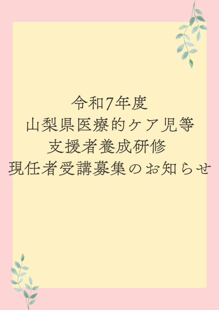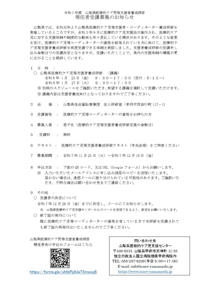令和7年度 山梨県医療的ケア児等支援者養成研修現任者受講募集のお知らせ 研修・講習 2025.11.25 山梨県医療的ケア児等支援者養成研修 現任者募集申込URLはこちら https://forms.gle/uhtbPjdUeT5mxsoj6